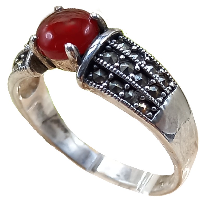 Anel confeccionado em Prata 925, cravejado de marcassitas e pedra natural Ágata Vermelha