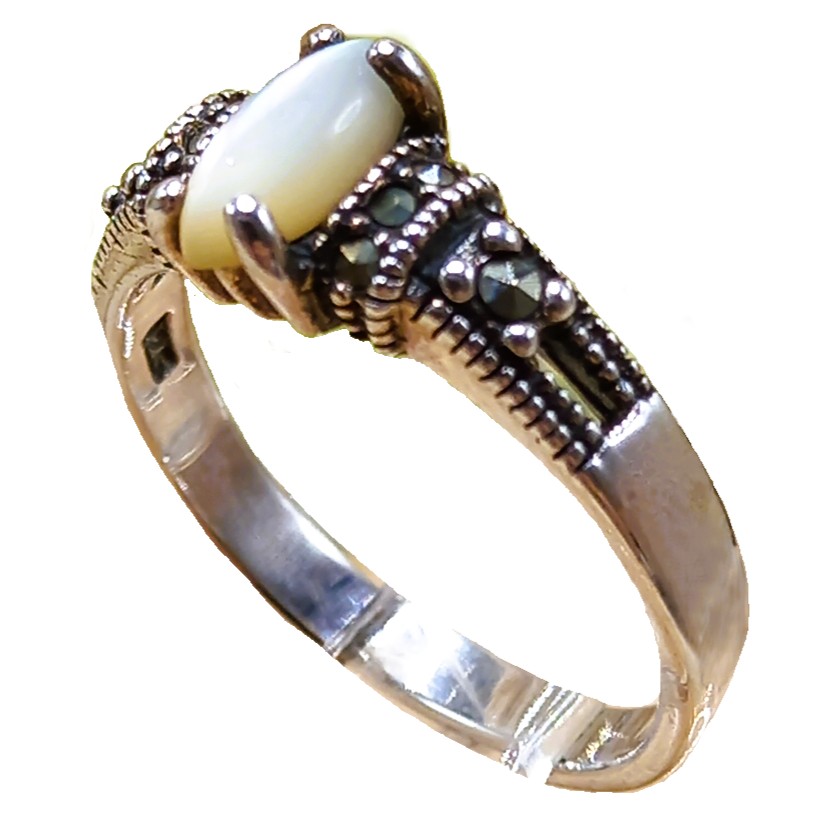 Anel confeccionado em Prata 925, cravejado de marcassitas e Madrepérola