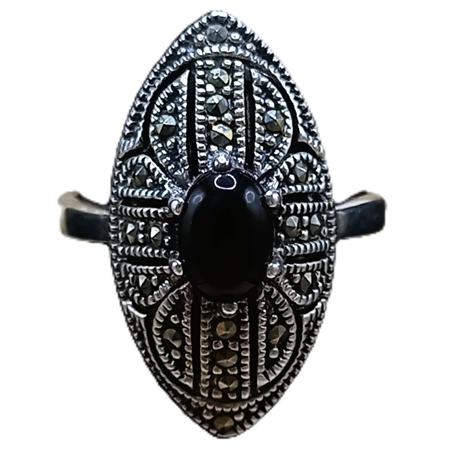 Anel confeccionado em Prata 925, cravejado de marcassitas e pedra natural Ônix