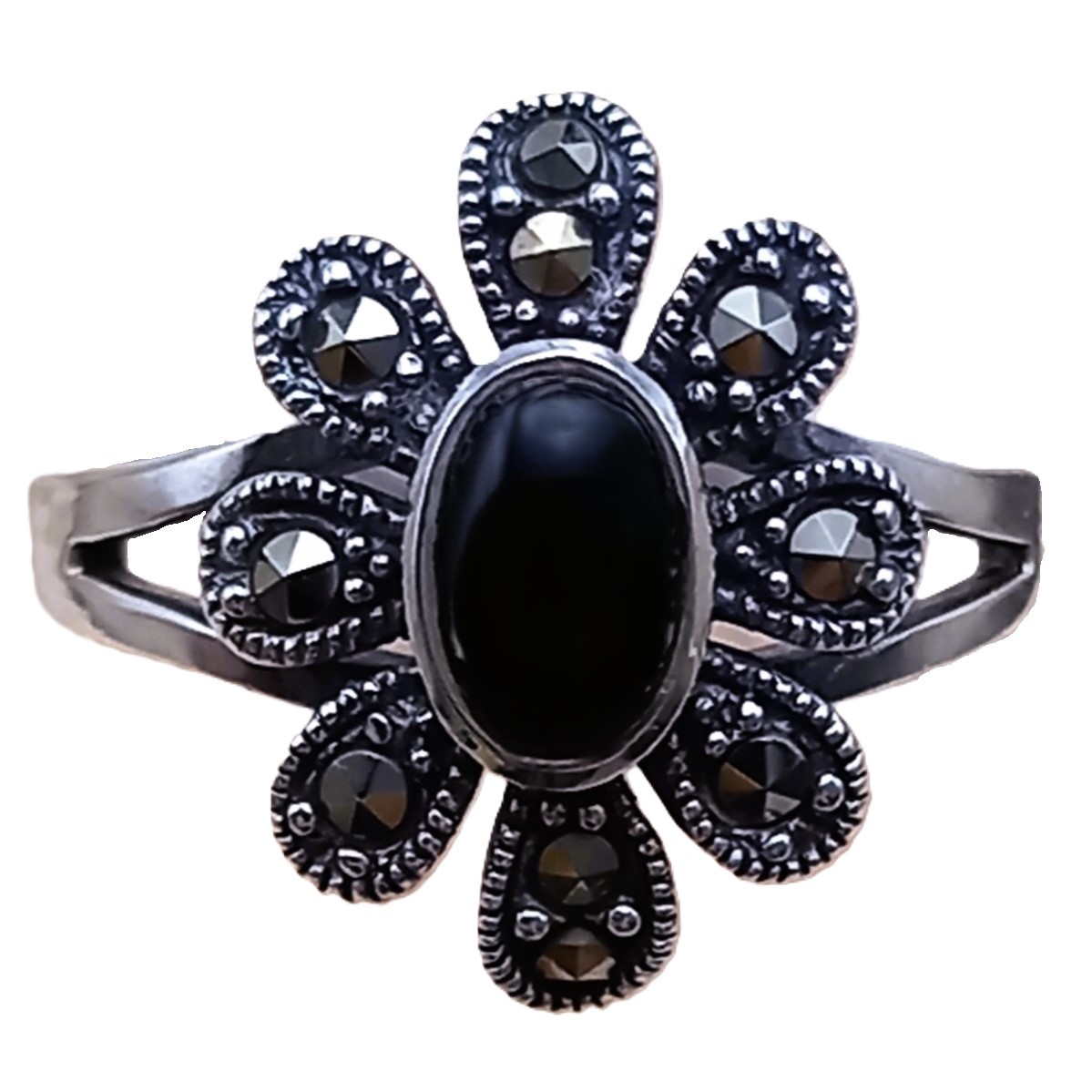 Anel confeccionados em Prata 925, cravejado de Marcassitas e Pedra Ônix