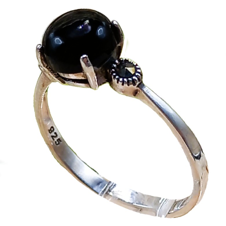 Anel confeccionado em Prata 925, marcassitas e esfera de pedra ônix