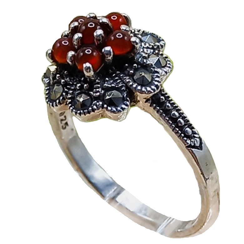 Anel confeccionados em Prata 925, cravejado de Marcassitas e esferas de Ágata Vermelha