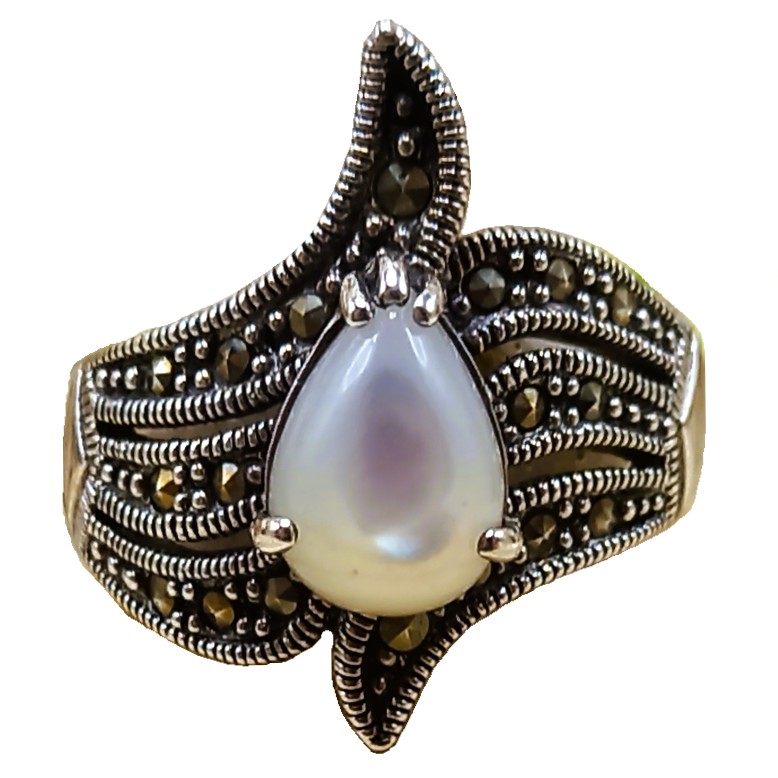Anel confeccionado em Prata 925, cravejado de marcassitas e Madrepérola