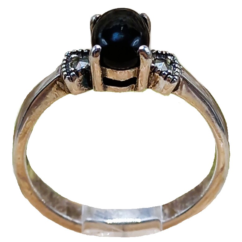 Anel confeccionado em Prata 925, cravejado de marcassitas e pedra natural Ônix