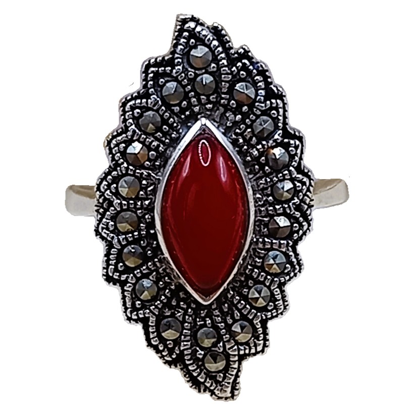 Anel confeccionado em Prata 925, cravejado de marcassitas e pedra natural Ágata Vermelha