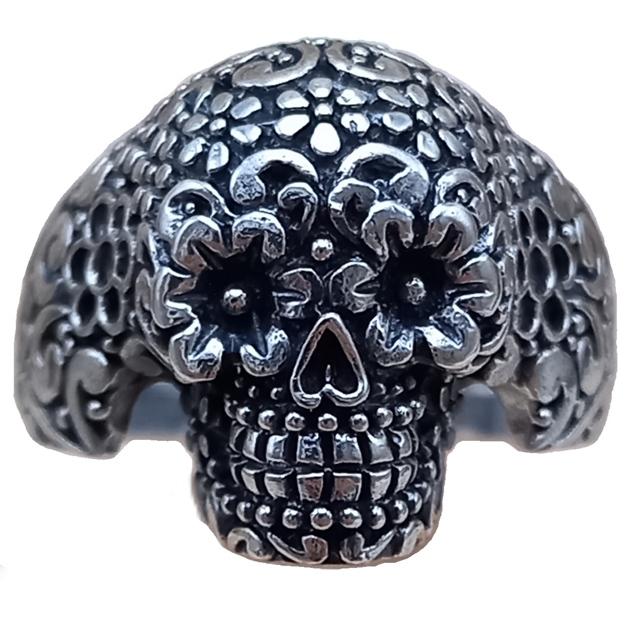 Anel Caveira, confeccionado em Prata 925, trabalhado em flores, com acabamento envelhecido e polido