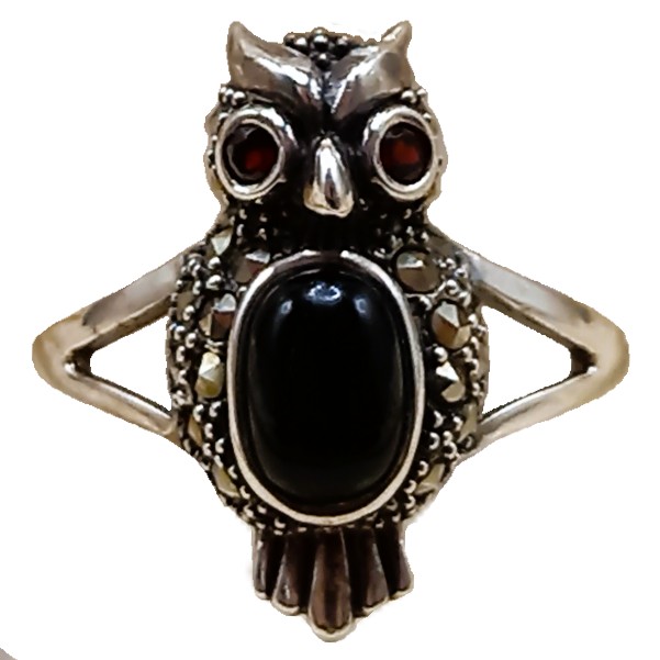 Anel Corujinha confeccionado em Prata 925, cravejado de marcassitas, olhos em granada e barriga em pedra Ônix