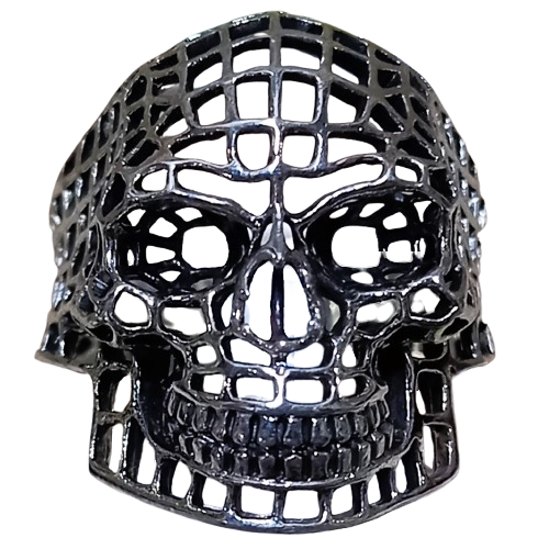 Anel Caveira, confeccionado em Prata 925, trabalhado vazado, com acabamento envelhecido e polido