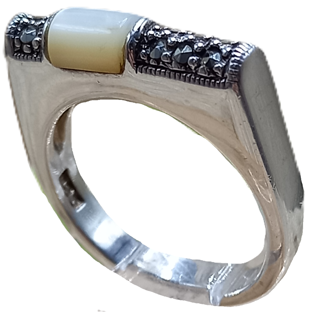Anel confeccionado em Prata 925 cravejado de Marcassitas e Pedra Natural Madrepérola
