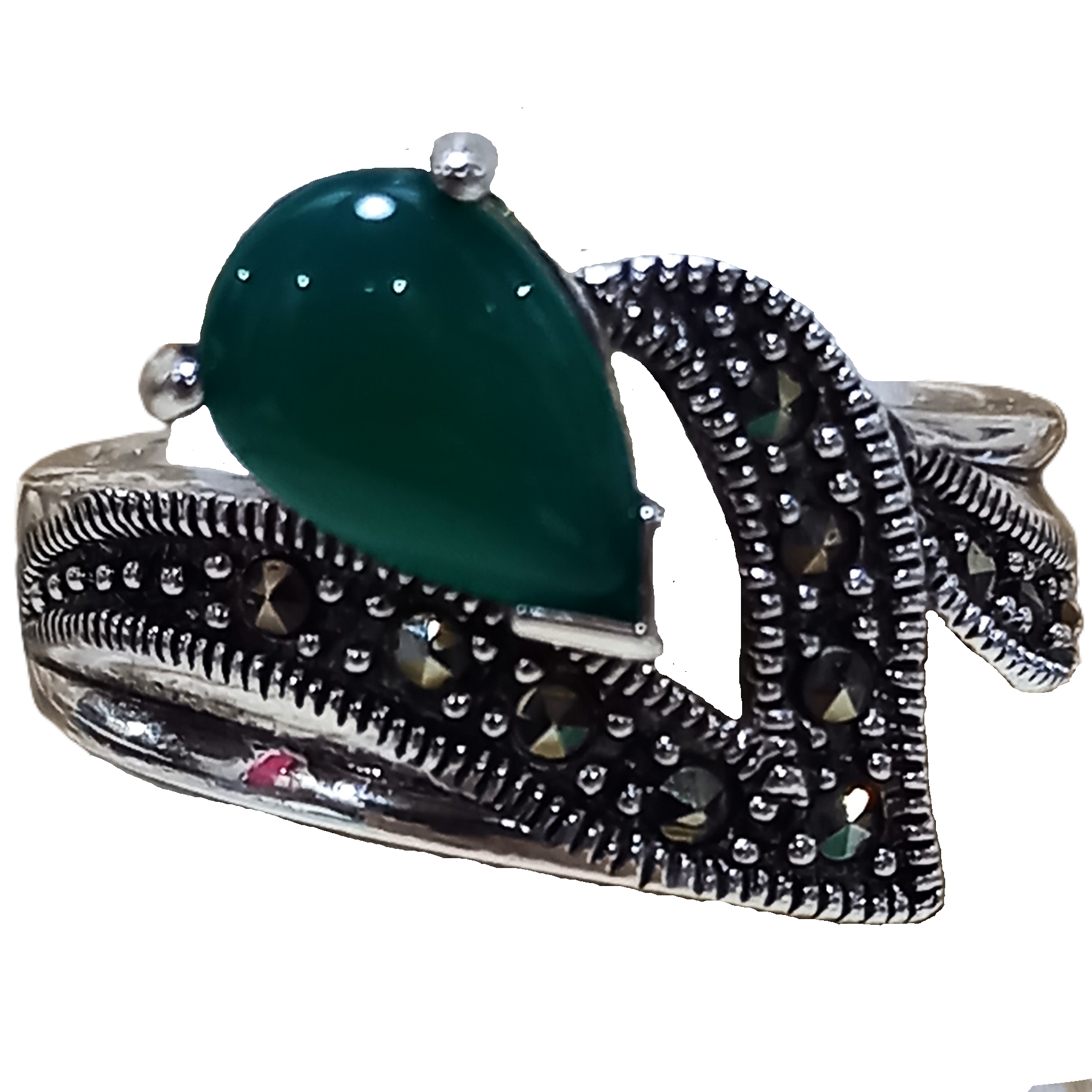 Anel confeccionado em Prata 925, cravejado de marcassitas e detalhes em pedra Ágata Verde natural