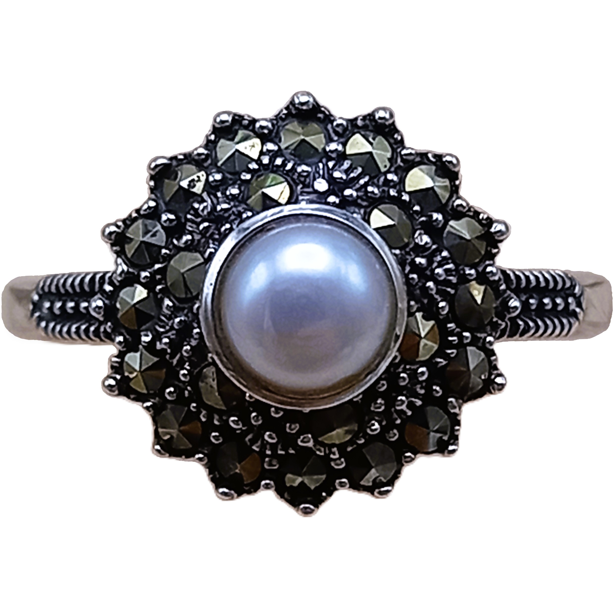 Anel confeccionado em Prata 925, Pérola de Água Doce e Marcassitas, com acabamento envelhecido e polido