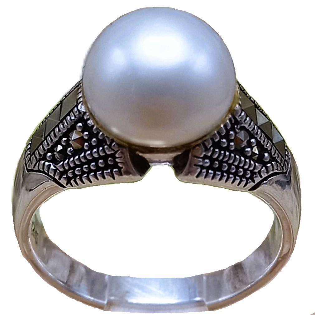 Anel confeccionado em Prata 925, Pérola de Água Doce e Marcassitas, acabamento envelhecido e polido