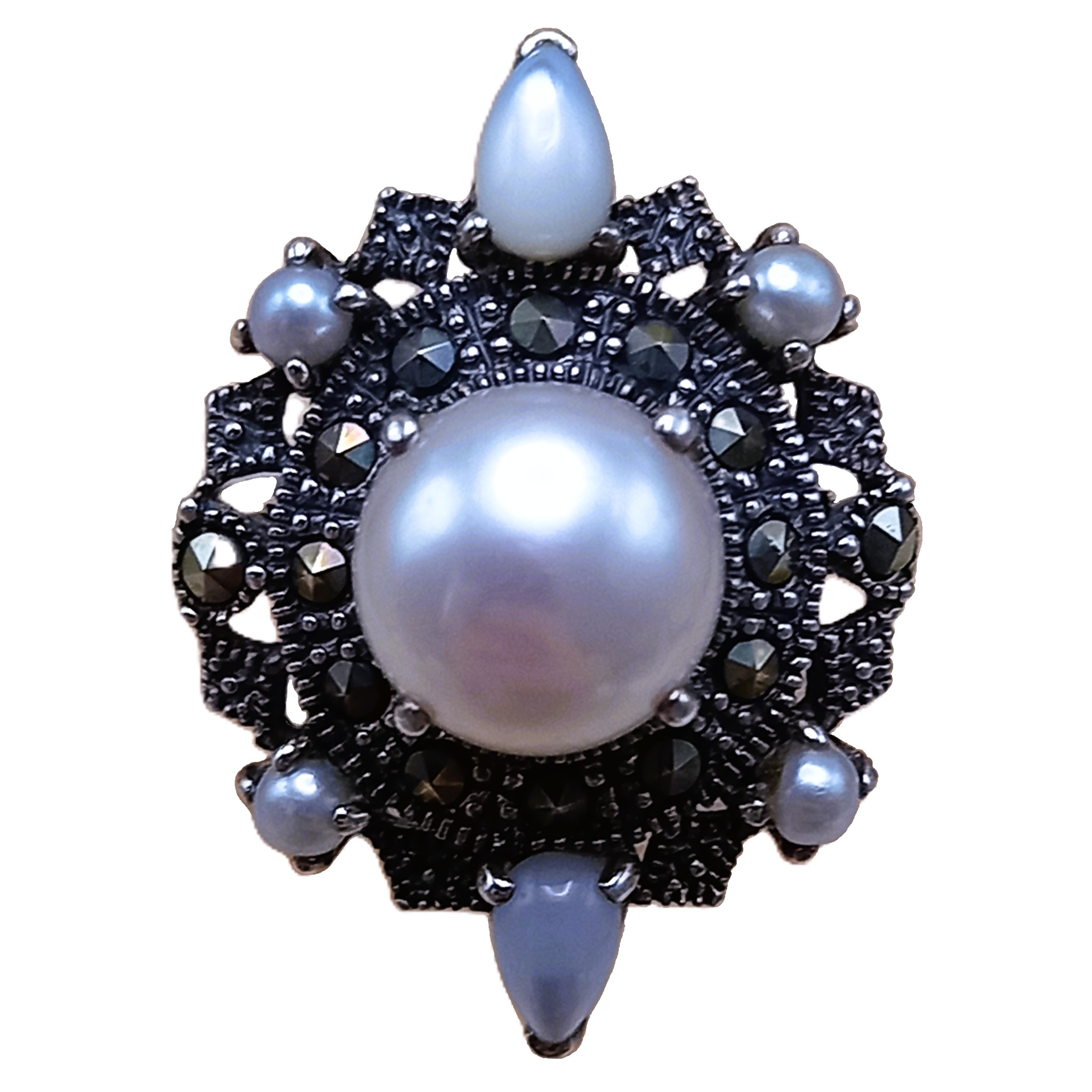 Anel confeccionado em Prata 925, Pérola de Água Doce, Madrepérola e Marcassitas, com acabamento envelhecido e polido