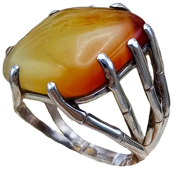 Anel confeccionado em Prata 925 com a base trabalhada em hastes com forma de bambu e pedra Ágata Mel quadrada com acabamento arredondado