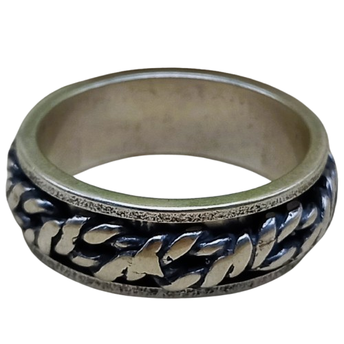 Anel confeccionado em Prata 925, com aros em sobreposição, sendo o central trabalhado e giratório, acabamento envelhecido