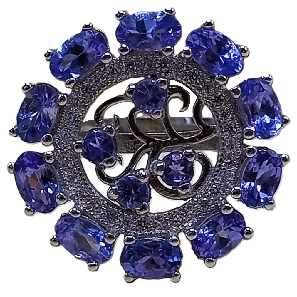 Anel confeccionado em Prata 925, banhado a rodium, cravejado de microzircônias e pedras tanzanita lapidadas