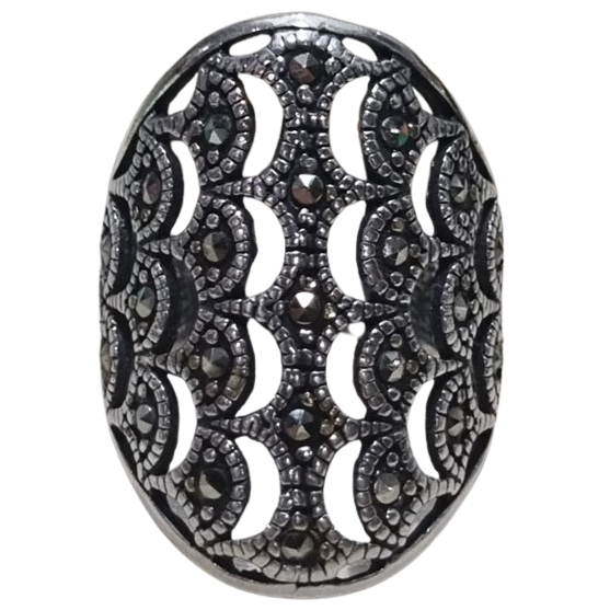 Anel confeccionado em Prata 925, com detalhes em escamas vazadas até as laterais, cravejado de marcassitas