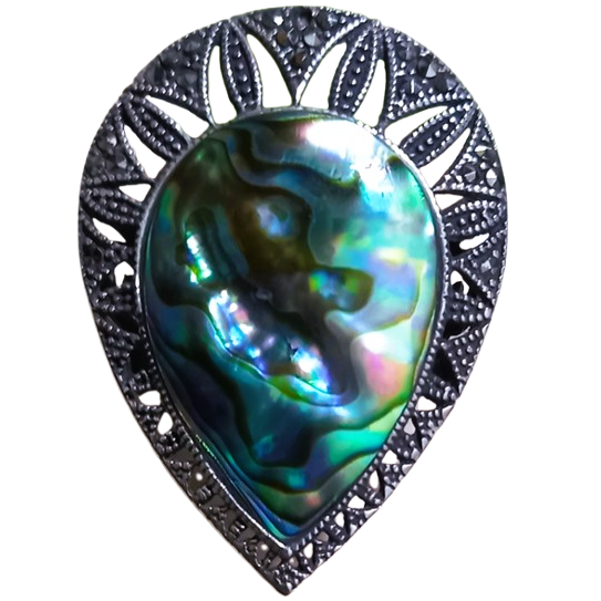 Anel confeccionado em Prata 925, com incrustações de Marcassitas e Abalone natural