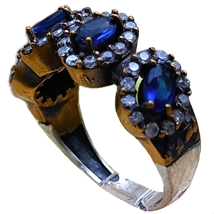 Anel Turco confeccionado em Prata 925 e Bronze, cravejado de zircônias nas cores Azul e Cristal
