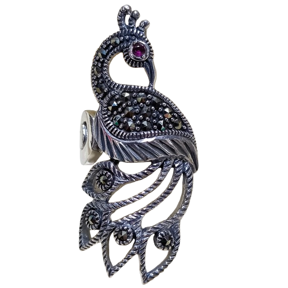 Anel Pavão confeccionado em Prata 925, cravejado de Marcassitas, com olho em pedra natural rubi
