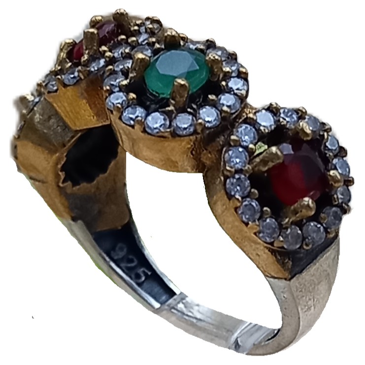 Anel Turco confeccionado em Prata 925 e Bronze, cravejado de zircônias Verde, Rubi e Cristal