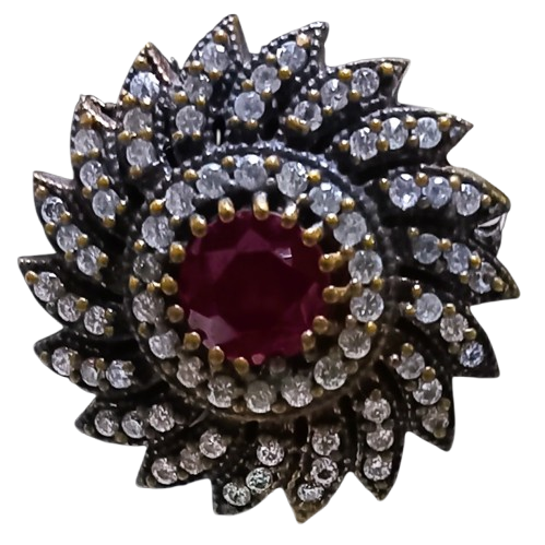 Anel Turco confeccionado em Prata 925 e Bronze, cravejado de zircônias na cor cristal e vermelha central