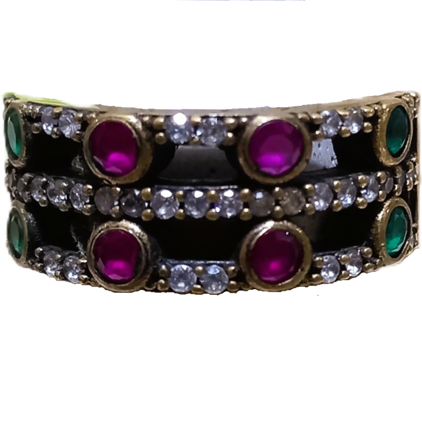 Anel confeccionado em Prata 925 e Bronze, cravejado de zircônias cristal, Rubi e Esmeralda Indianos