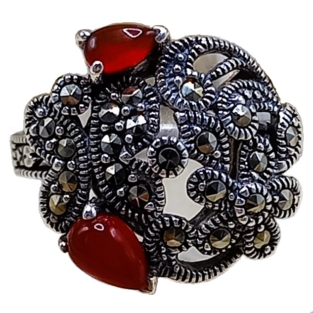 Anel Flor e Borboleta confeccionado em Prata 925, cravejado de marcassitas e pedra natural Ágata Vermelha
