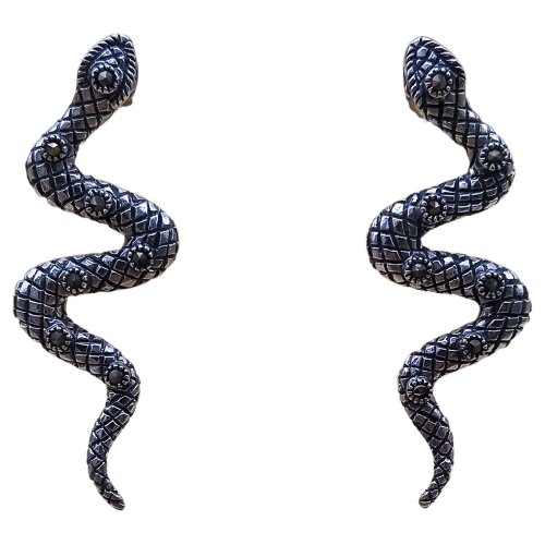 Par de Brincos Cobra Serpente de Prata 925, trabalhada com detalhes em marcassitas e acabamento envelhecido e polido
