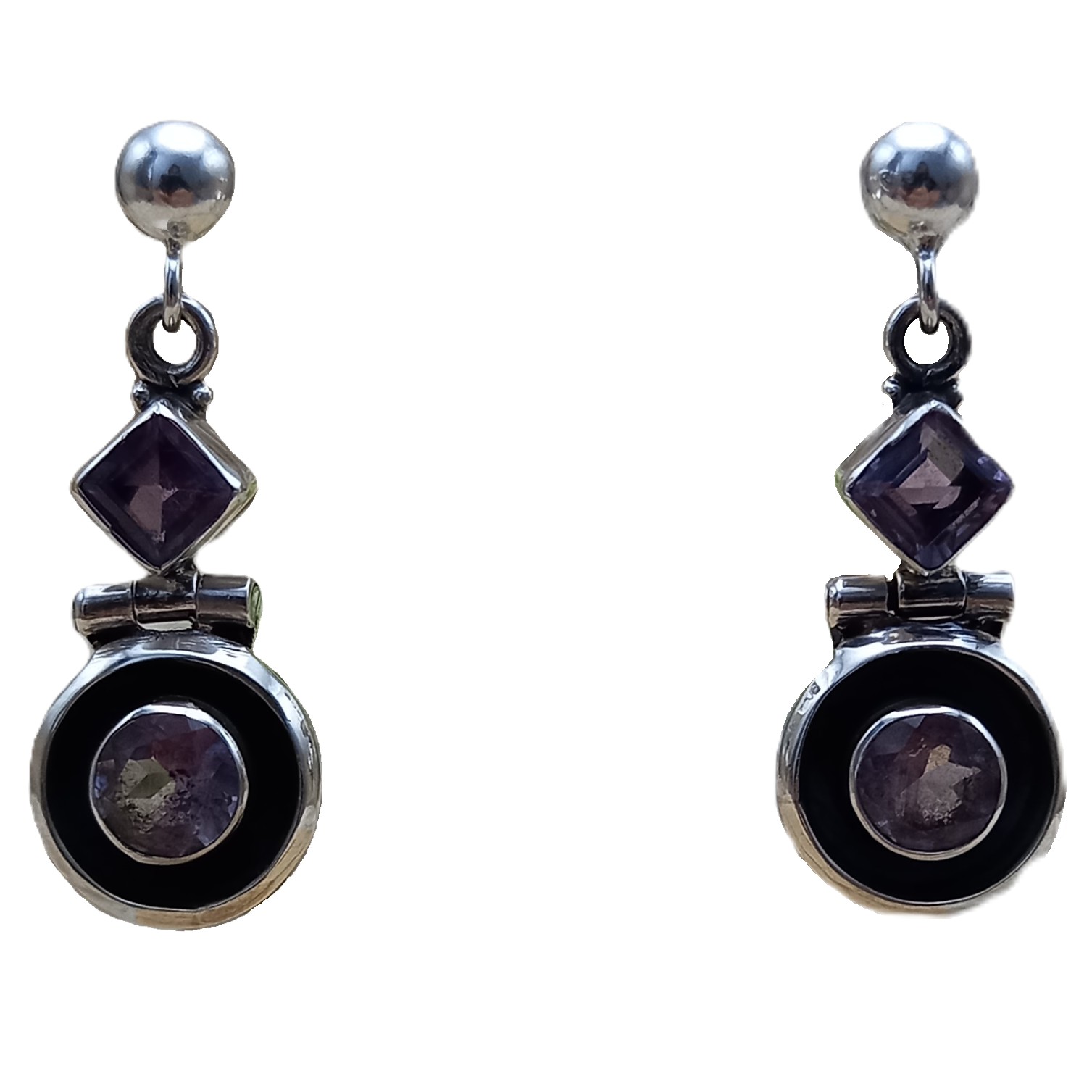Par de Brincos confeccionados em Prata 925 com acabamento envelhecido e polido e Pedra Ametista natural lapidada