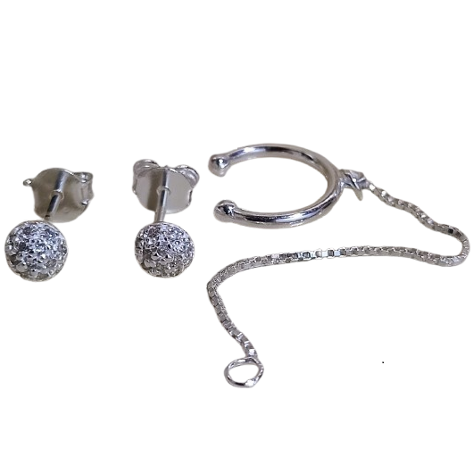 Par de Brincos, cravejados de zircônias cristal, com um Piercing Fake de encaixe com corrente veneziana, confeccionados em Prata 925
