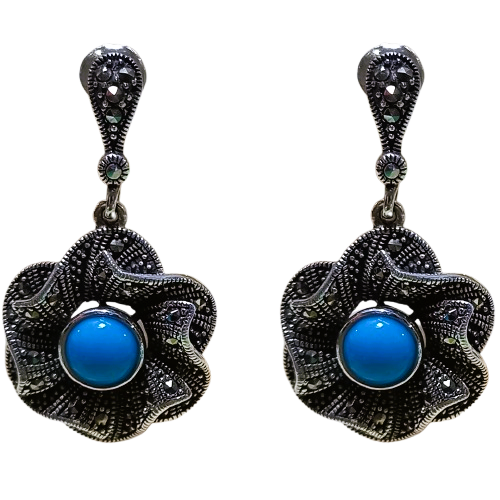 Par de Brincos confeccionado em Prata 925, com Marcassitas e Pedra Turquesa