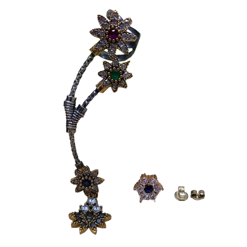 Par de Brincos Assimétricos, confeccionados em Prata 925 e Bronze, cravejados de zircônias nas cores Pink, Verde, Azul Marinho e Cristal