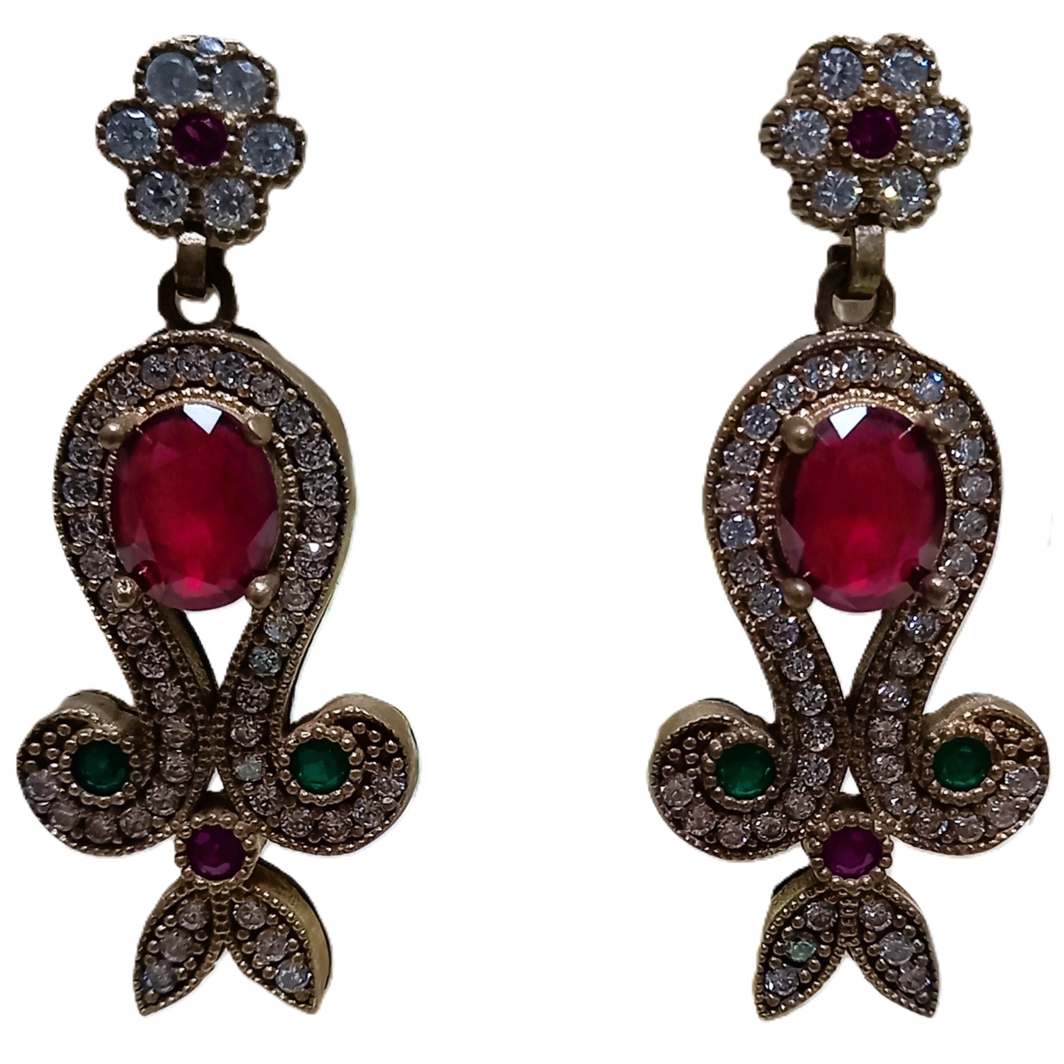 Par de Brincos, confeccionado em Prata 925 e Bronze, cravejado de zircônias Cristal, vermelha central e rubis e esmeralda indianos