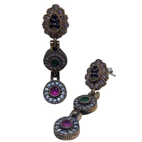 Par de Brincos confeccionados em Prata 925 e Bronze, cravejado de zircônias nas cores azul marinho, verde e cristal