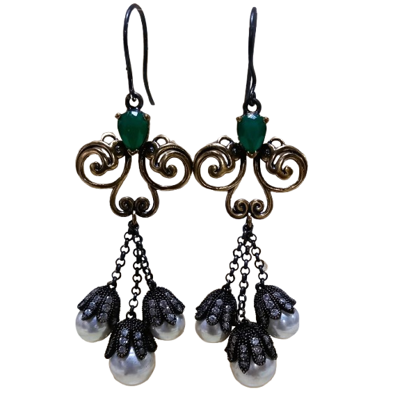Par de Brincos confeccionados em Prata 925 e Bronze, com banho de ródio negro, cravejado de zircônias cristal, verdes e pérolas shell