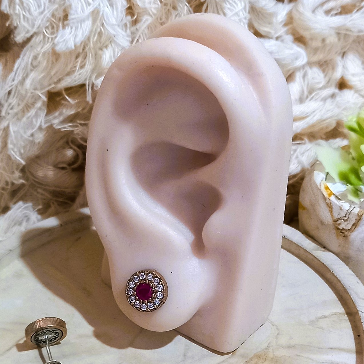 Brinco Turco confeccionado em Prata 925 e Bronze, modelo redondo com zircônias nas cores Rubi e Cristal