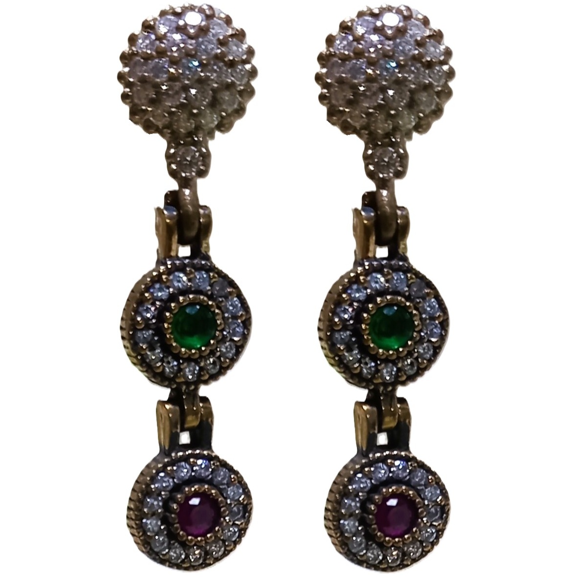 Par de Brincos confeccionados em Prata 925 e Bronze, cravejado de zircônias nas cores pink, verde e cristal