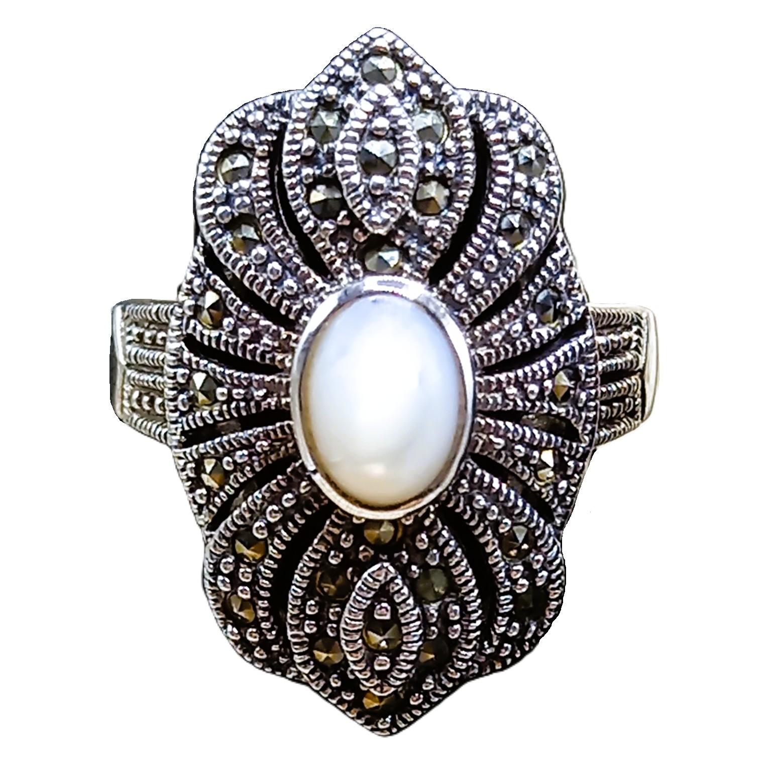 Anel confeccionado em Prata 925, cravejado de marcassitas e Madrepérola oval