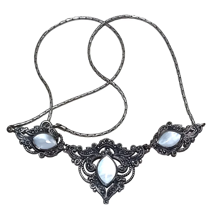 Colar confeccionado em Prata 925, incrustado de marcassitas e detalhes em madrepérola natural