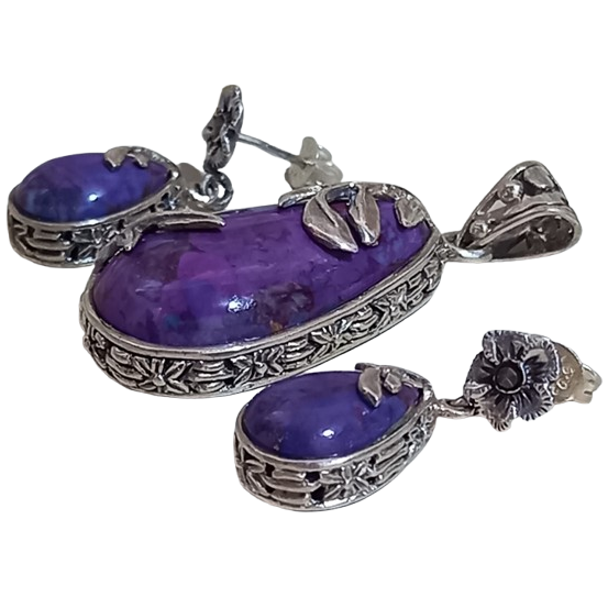 Conjunto de Par de Brincos e Pingente, confeccionados em Prata 925 e Pedra Sintética Opala Roxa