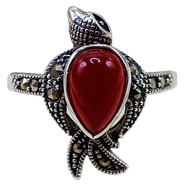 Anel Passarinho confeccionado em Prata 925, cravejado de marcassitas e pedra natural Ágata Vermelha