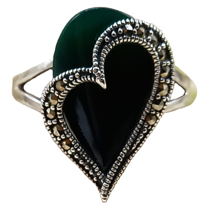 Anel Coração confeccionado em Prata 925, cravejado de marcassitas e pedra natural Ágata Verde