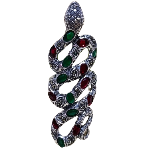 Anel confeccionado em Prata 925, cravejado de Marcassitas e incrustações em rubi e esmeralda indianos. Acabamento envelhecido e polido.