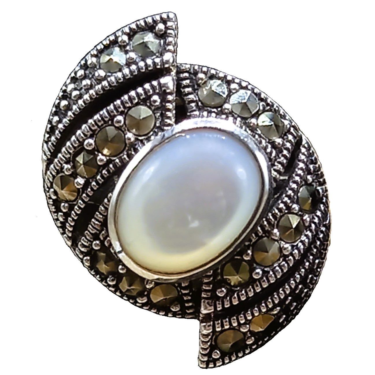 Anel confeccionado em Prata 925, cravejado de marcassitas e Madrepérola