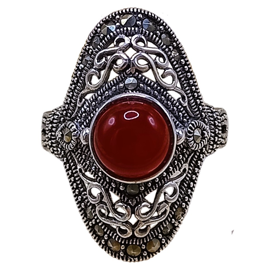 Anel confeccionado em Prata 925, cravejado de marcassitas e pedra natural Ágata Vermelha
