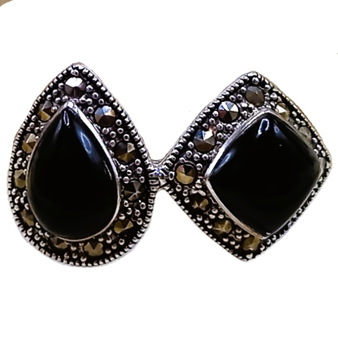 Anel Gota e Losango confeccionado em Prata 925, cravejado de marcassitas e pedra natural Ônix