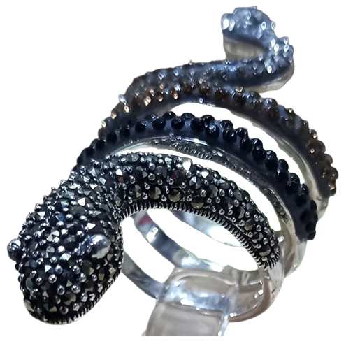 Anel Cobra Serpente confeccionado em Prata 925, cravejado de Marcassitas e Zircônias nas cores cristal, dourada e negra