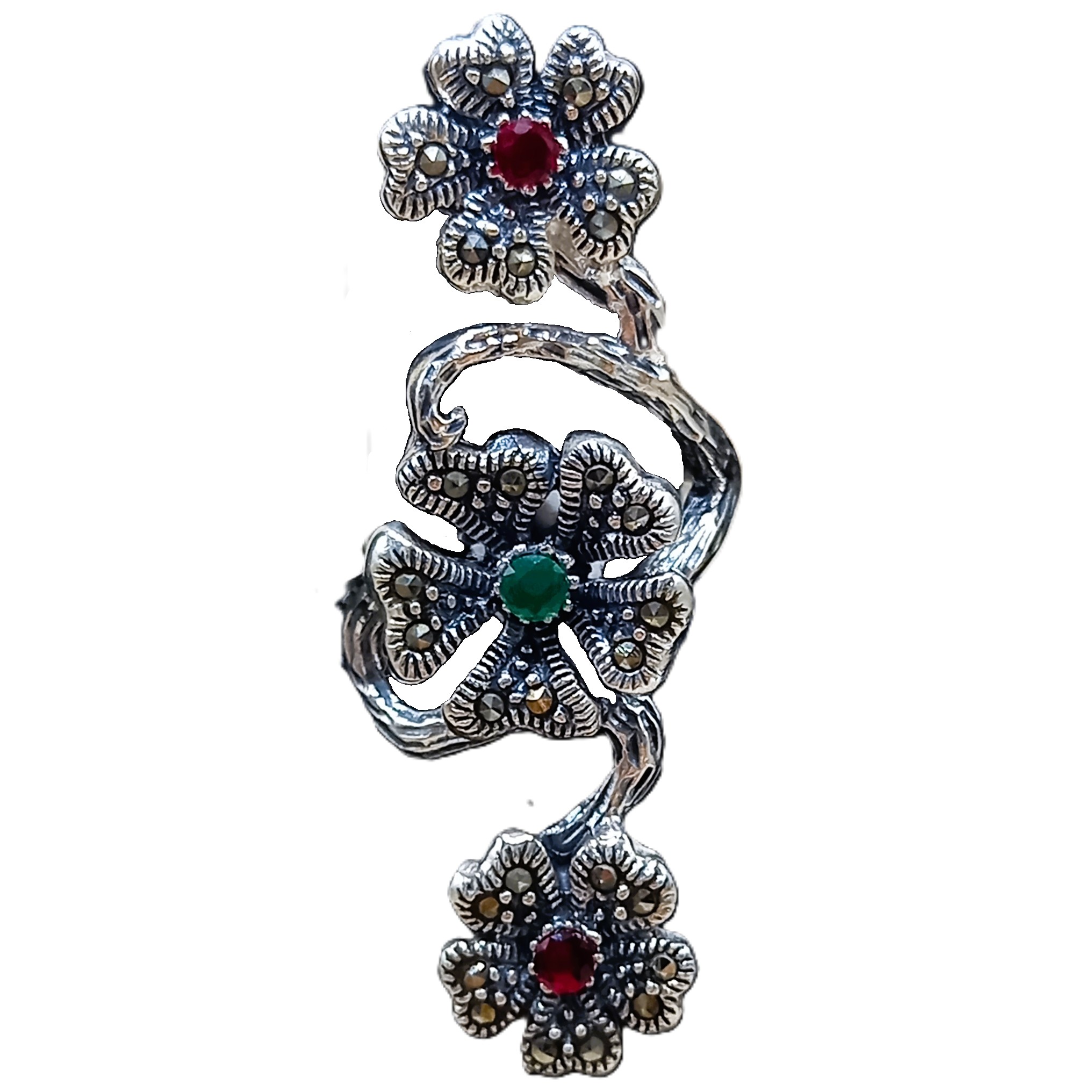 Máxi Anel Flores confeccionado em Prata 925, cravejado de Marcassitas, com Rubi e Esmeralda Indianos