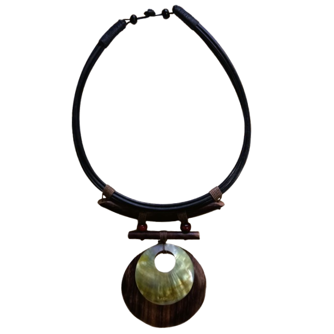 Colar confeccionado em fio sintético com detalhes em semente, madeira e Madrepérola